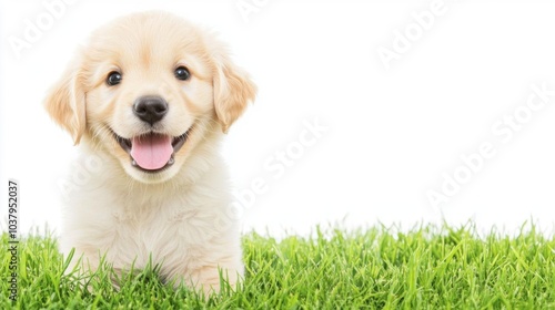 A cheerful golden retriever puppy sitting on lush green grass, exuding playfulness and innocence against a white background.