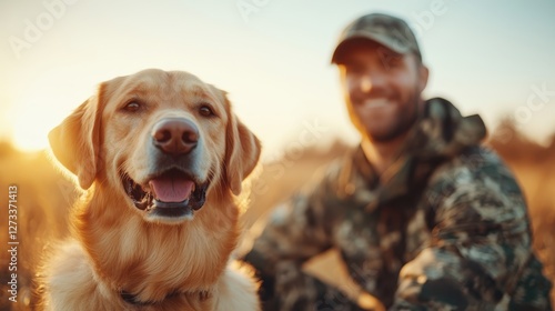 A cheerful golden retriever sits proudly beside a smiling man, both enjoying a beautiful sunset in an open field, exemplifying the joy of companionship and adventure.