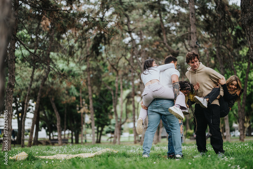 A cheerful group of friends spends quality time outdoors, engaging in playful interactions amidst a serene forested park setting, enjoying camaraderie and nature.