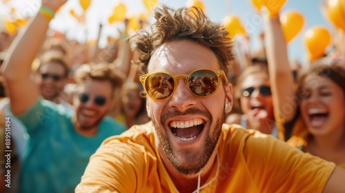 A cheerful group of friends with orange balloons at an outdoor festival on a sunny day, capturing a moment of joy and celebration together with wide smiles and excitement.
