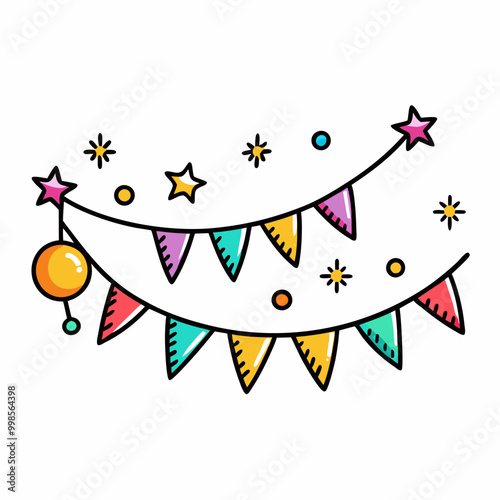 A cheerful illustration of a festive bunting with colorful flags, stars, and confetti, perfect for adding a touch of celebration to your designs. This vibrant graphic is ideal for party invitations.