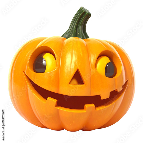 A cheerful jack-o'-lantern with a smiling face, perfect for Halloween decorations. It's an orange pumpkin with carved eyes, nose, and a big grin.