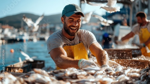 A cheerful man wearing a yellow apron smiles broadly as he works with fish at a busy harbor, capturing the essence of hard work and joy in a vibrant environment.