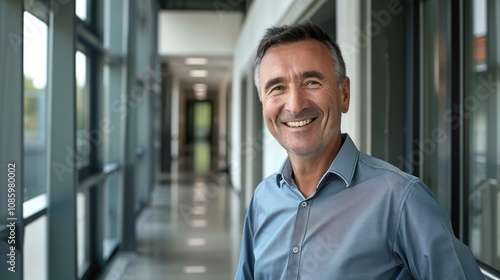 A cheerful man with a bright smile on his face, wearing a blue shirt and possibly ready to take on the day