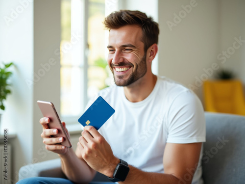 A cheerful man with a smartphone and credit card in hand, radiating satisfaction in a bright, modern, welcoming space.