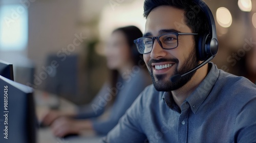 A cheerful man with glasses and a headset interacts with clients at a computer station, showcasing a positive atmosphere in a modern workspace.