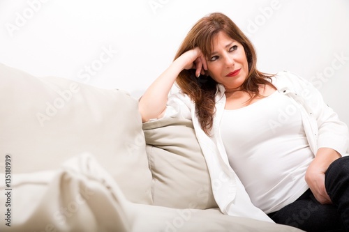 A cheerful mature woman sitting on the sofa at home..
