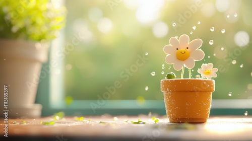 A cheerful potted flower with a smiling face, surrounded by sunlight and gentle raindrops, creating a whimsical and uplifting atmosphere.