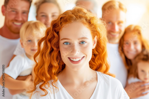 A cheerful redheaded woman smiling at the camera while her family stands slightly blurred in the background, bathed in warm natural light, creating a cozy and joyful atmosphere.