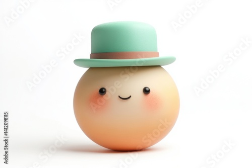 A cheerful, round cartoon character wearing a mint green bowler hat, smiling happily.