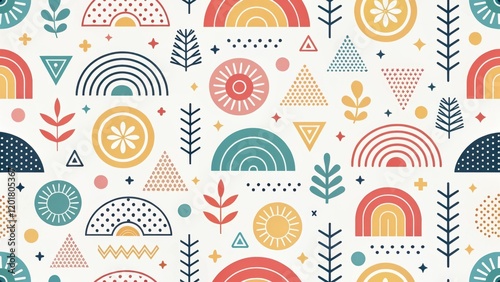 A cheerful seamless pattern featuring rainbows, suns, geometric shapes, and stylized floral elements in a vibrant color palette.