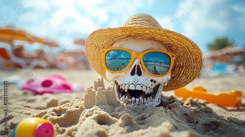 A cheerful skull dressed in sunglasses and a hat rests on sandy shores