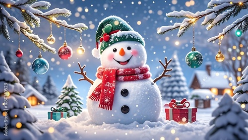 A cheerful snowman with a red scarf and hat stands in a snowy winter landscape with Christmas lights and ornaments, gifts, and a small village in the background.