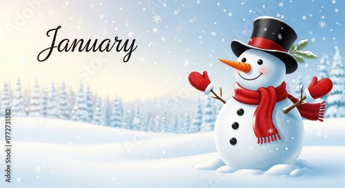 A cheerful snowman with a top hat and scarf stands in a snowy january landscape