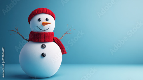 A cheerful snowman with button eyes and red scarf stands against blue background