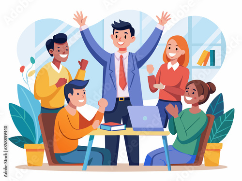 A cheerful team leader praising their team during a meeting