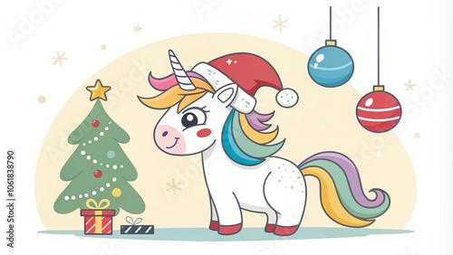 A cheerful unicorn wearing a Santa hat beside a decorated Christmas tree, perfect for festive illustrations and holiday themes.