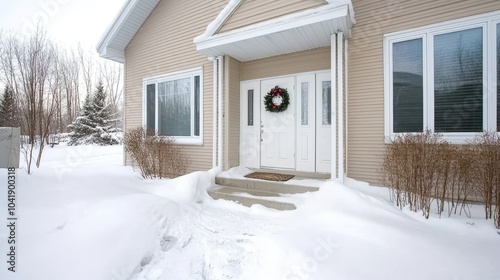 A cheerful white front door with a green wreath welcomes visitors on a bright sunny day amidst a snow-covered yard