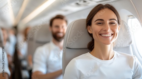 A cheerful woman with a broad smile sits comfortably in an airplane seat, wearing a white shirt, while other passengers are seen in the background also in white attire.