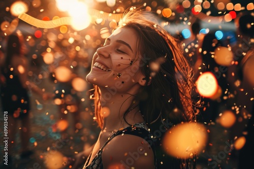 A cheerful woman with sunglasses and a hat, covered in sparkles, laughs as she is surrounded by colorful confetti, capturing the spirit of celebration
