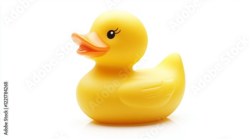 A cheerful yellow rubber ducky, a classic bath toy, sits against a bright white background.