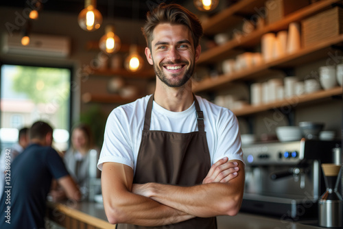 A cheerful young barista standing confidently in a modern cafe. Warm lighting