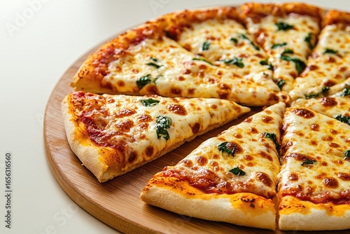 A cheese pizza, sliced into eight, rests on a wooden board. The pizza features melted mozzarella, tomato sauce, and scattered basil. A few slices are slightly separated