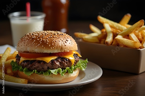 A cheesy burger with delicious potato fries with souces