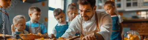 A chef actively guides a group of young children in a cooking class, teaching them culinary skills with enthusiasm and attentiveness.