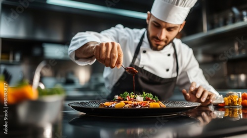 A chef in a professional kitchen garnishing a gourmet dish with fresh herbs, copy space