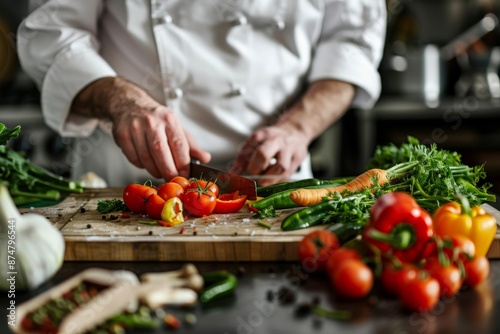 A chef in a white uniform is chopping tomatoes on a wooden cutting board. Fresh vegetables, including peppers, carrots, and cucumbers, surround the board