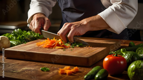 A chef is cutting vegetables on a wooden cutting board. The vegetables include tomatoes, peppers, and onions