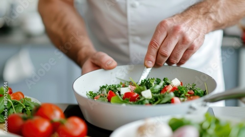 A chef is depicted meticulously preparing a fresh vegetable salad, focusing on vibrant and healthy ingredients, demonstrating skill and dedication in a professional kitchen setting.