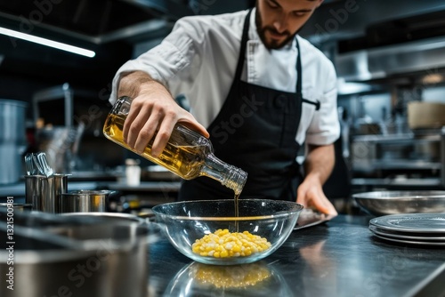 A chef pouring oil into a bowl of corn