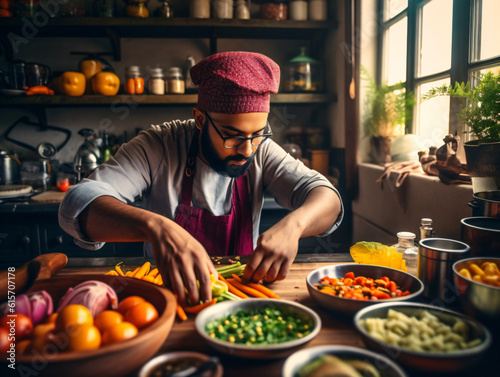 A chef preparing a colorful and nutritious meal in a well-organized kitchen, surrounded by fresh ingredients and vibrant spices . Generative AI.