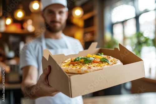 A chef presents a freshly baked pizza in a takeout box at a cozy restaurant during daytime