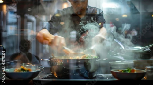 A chef skillfully prepares a delicious dish, creating steam and flavor in a vibrant kitchen setting. Culinary art in action.