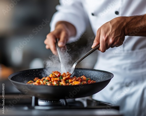 A chef skillfully sauteing colorful vegetables in a hot pan, showcasing culinary expertise and vibrant food presentation.