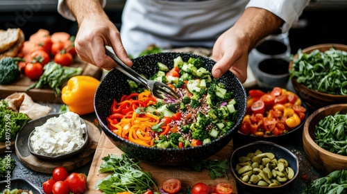 A chef tosses a vibrant salad of broccoli, red and orange bell peppers, and quinoa in a dark bowl surrounded by fresh vegetables on the table