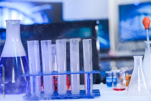 A chemical reaction in a science laboratory. Vapor billows from a flask of purple liquid and a rack of test tubes, creating a dynamic and mysterious scientific background.