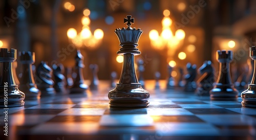 A chess board is surrounded by a king piece and other pieces. It represents the world order and illuminates the surroundings.