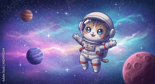 A chibi astronaut cat floating in space, dreamy digital painting for kids' books or merch.