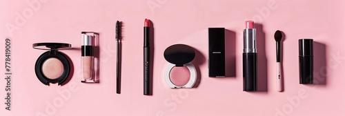 A chic display of 5 essential makeup items on a pink background from lipstick to mascara, embodying beauty and elegance