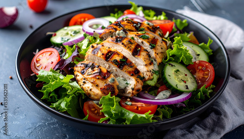 a, chicken, salad, of, fillets, fillet, food, meal, new, modern, macro, close, up, dinner, stripes, grilled, grill, photography, meat, dish, salad, vegetable, plate, cuisine, rice, pork, healthy, ad