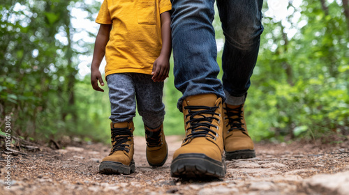 A child and adult walking together on a dirt path in a forest, both wearing sturdy boots, enjoying nature and companionship.