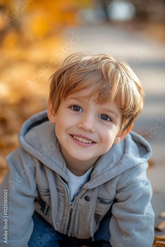 A child in a gray jacket smiles while enjoying the warm colors and cozy leaves of a crisp autumn day.