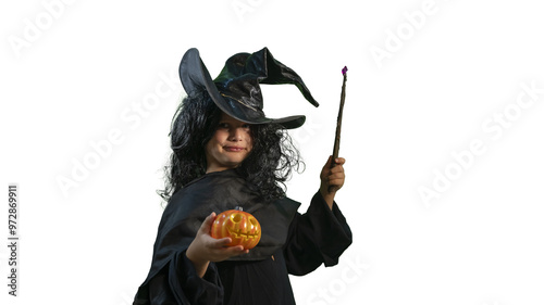 A child in a Halloween witch costume with a magic wand