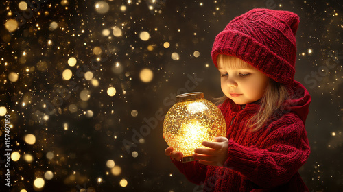 A child in a red sweater and hat holds a glowing lantern amidst a sparkling background.