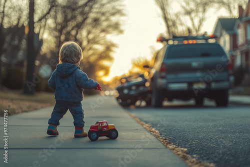 A child observes from the sidewalk while playing with a toy car on a sunny afternoon in the neighborhood