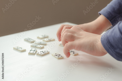 A child plays dominoes. Hands arrange the knuckles of dominoes. The concept of board games on self-isolation.